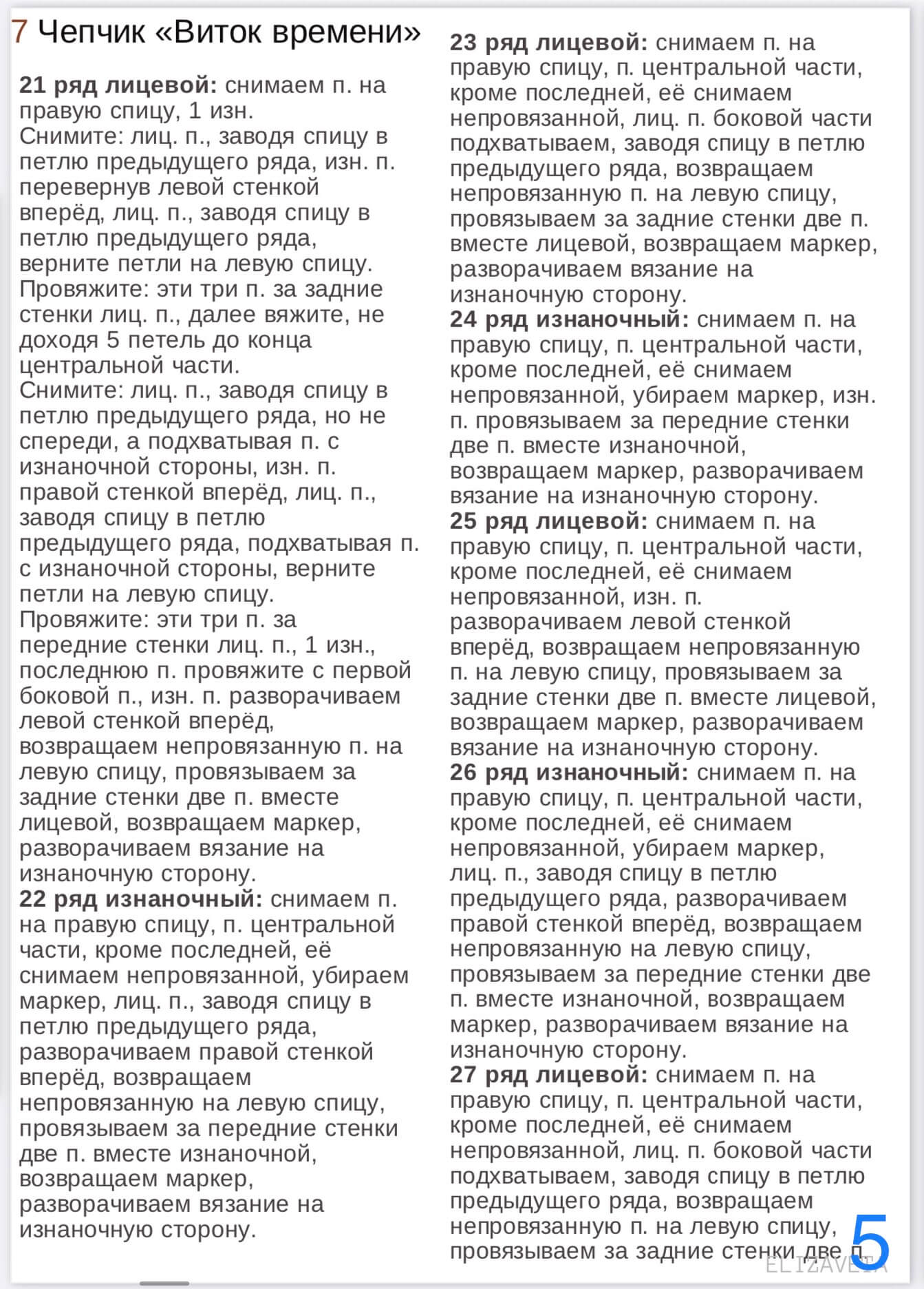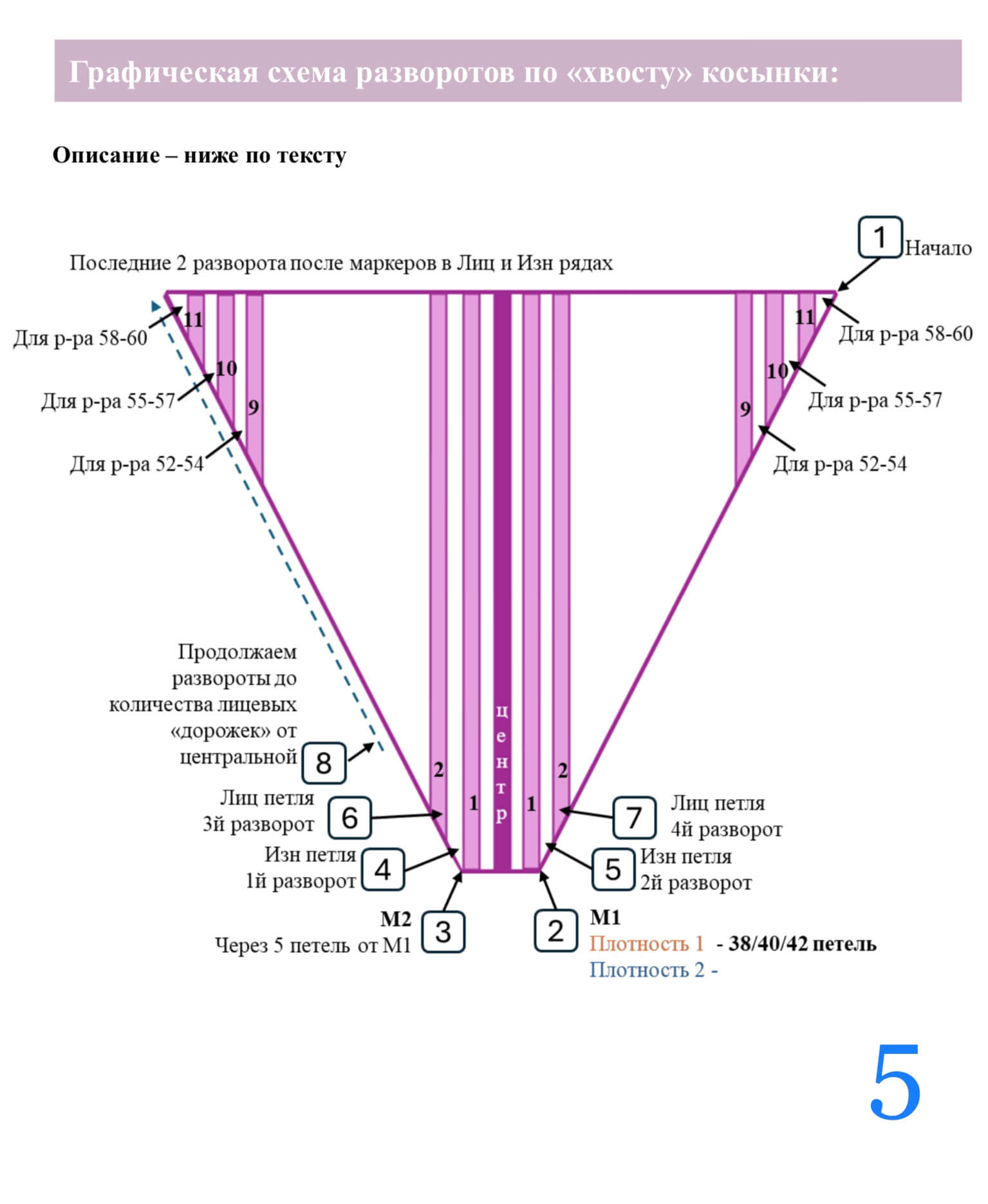 Далее, приступаем к убавлениям. Убавления делаем в каждом 2-ом лиц. ряду 2 ВМ Л (2 вместе лиц) с наклоном влево до центральной изн. пет., и после центральной изн. пет. 2 ВМ Л с наклоном вправо.