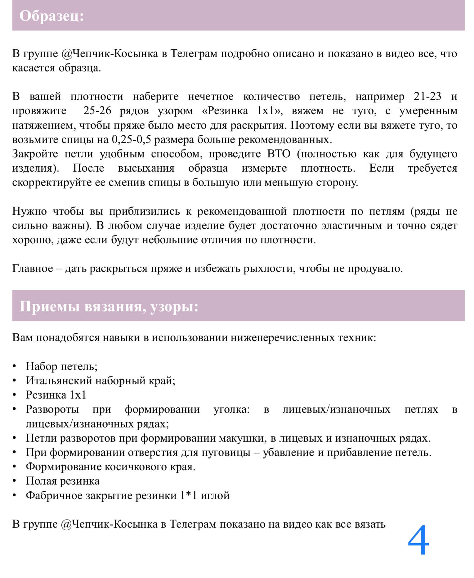 Вы можете взять любую пряжу, похожую по толщине на предложенную. Главное, чтобы плотность вашего образца была = 17 пет./23 р. Подобрать нужную плотность – не сложно! Не получается – возьмите спицы меньшего, или большего размера, чем 4,5 мм.