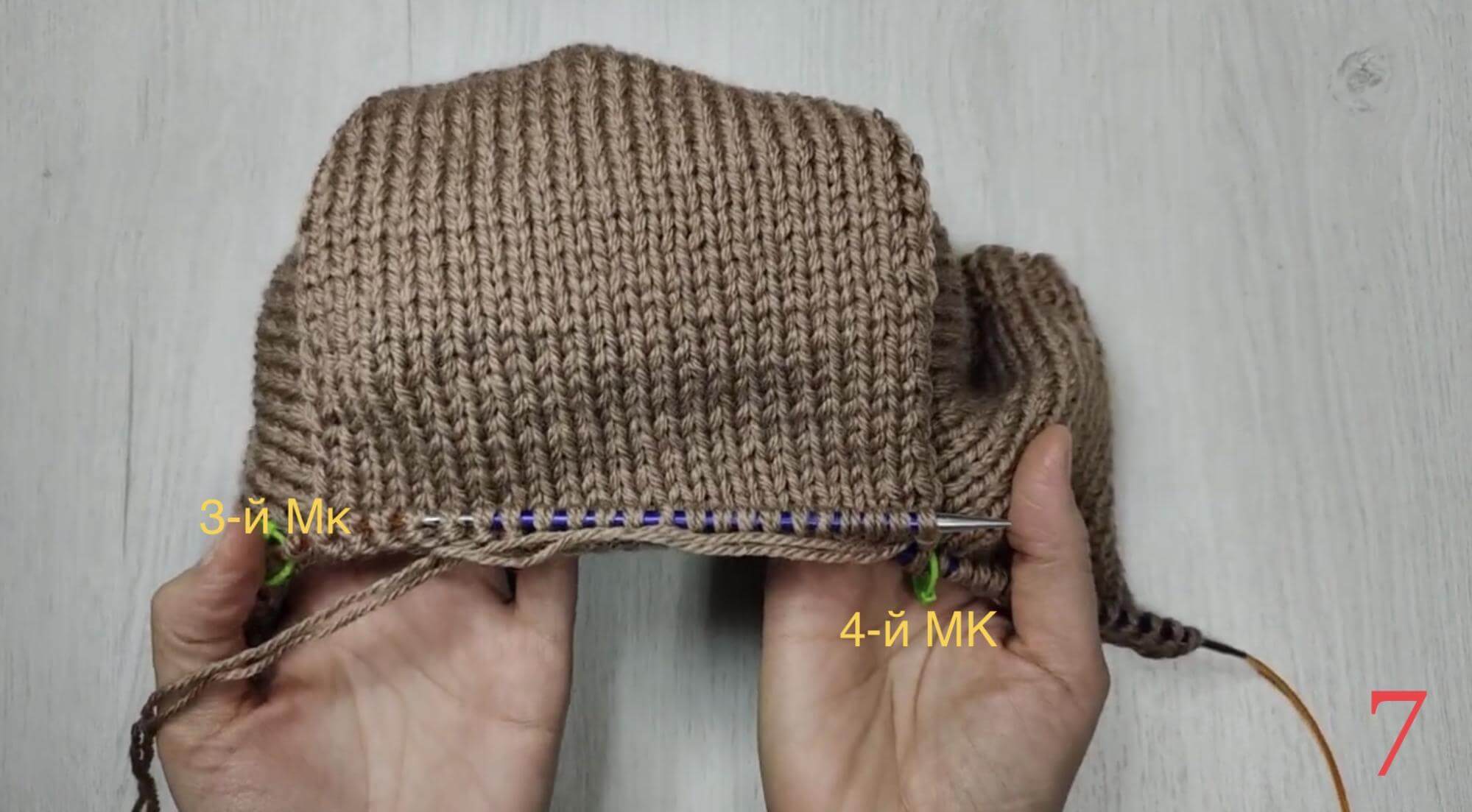 Далее, то кол-во пет., которые были с боков нужно разделить пополам (28 : 2 = 14). Отсчитываем по 14 пет. слева и справа и вешаем 2 МК.(3-й МК и 4-й МК). Будем делать убавки, пока не дойдём до этих двух МК. Дошли до нужного ряда, теперь у нас на спицах: 14+24+14 пет.